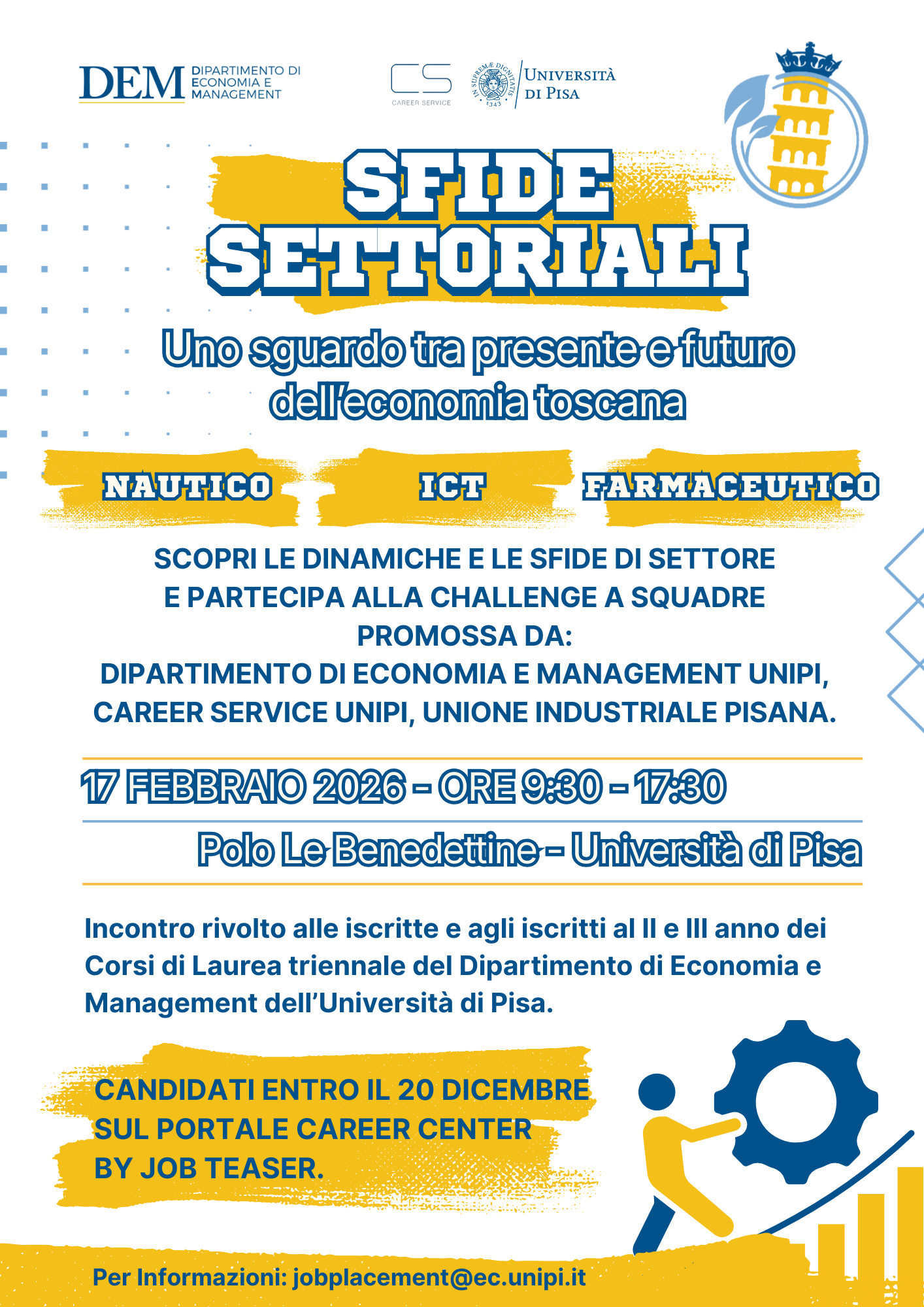 Il Dipartimento di Economia e Management dell’Università di Pisa invita le studentesse e gli studenti del secondo e terzo anno dei Corsi di Laurea Triennale a partecipare all’incontro “Le sfide settoriali. Uno sguardo tra presente e futuro dell’economia toscana”, una giornata di confronto tra istituzioni, imprese e mondo accademico dedicata ai trend e alle opportunità dei principali settori dell’economia toscana.