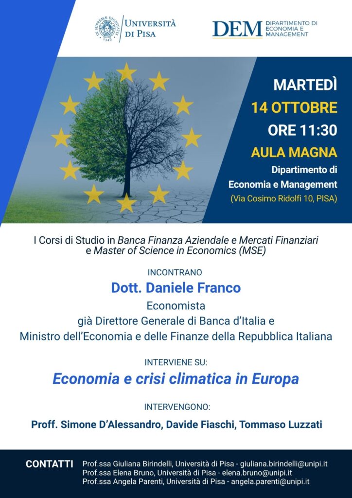 Martedì 14 ottobre 2025, alle ore 11:30 nell’Aula Magna del Dipartimento di Economia e Management (Via Cosimo Ridolfi 10, Pisa), i Corsi di Studio in Banca Finanza Aziendale e Mercati Finanziari e Master of Science in Economics (MSE) incontrano il Dott. Daniele Franco, economista, già Direttore Generale di Banca d’Italia e Ministro dell’Economia e delle Finanze della Repubblica Italiana, per un intervento su Economia e crisi climatica in Europa.
