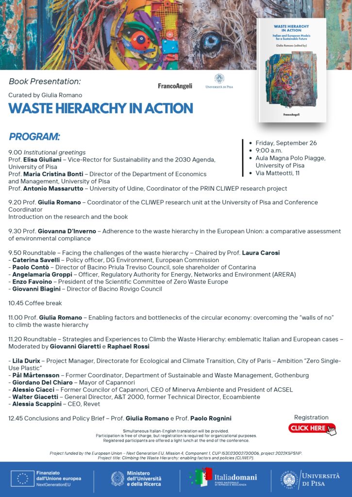 Venerdì 26 settembre 2025, dalle 9:00 alle 13:00, nella Sala convegni del Polo Didattico delle Piagge (Via Giacomo Matteotti 11, Pisa), si terrà il convegno di presentazione dei risultati della ricerca PRIN Climbing the Waste Hierarchy: enabling factors and policies, CLIWEP e del libro a cura di Giulia Romano “Gerarchia dei rifiuti in azione. Modelli italiani ed europei per un futuro sostenibile”, edito da FrancoAngeli Editore.
