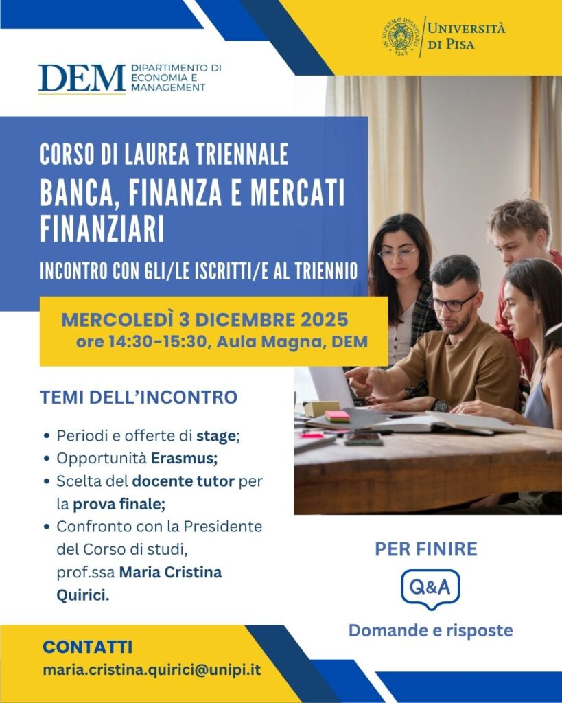 Il Corso di laurea triennale in Banca, Finanza e Mercati Finanziari organizza un incontro rivolto alle studentesse e agli studenti del triennio, in programma mercoledì 3 dicembre 2025, dalle 14:30 alle 15:30 in Aula Magna del Dipartimento, per rispondere alle domande e chiarire dubbi sul percorso formativo.