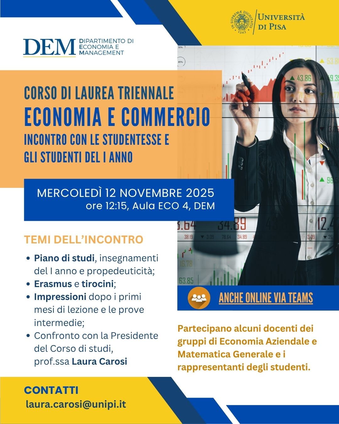 Il Corso di laurea triennale in Economia e Commercio organizza un incontro rivolto alle studentesse e agli studenti del I anno, in programma mercoledì 12 novembre 2025, alle ore 12:15 in Aula ECO 4 del Dipartimento e online su Teams.