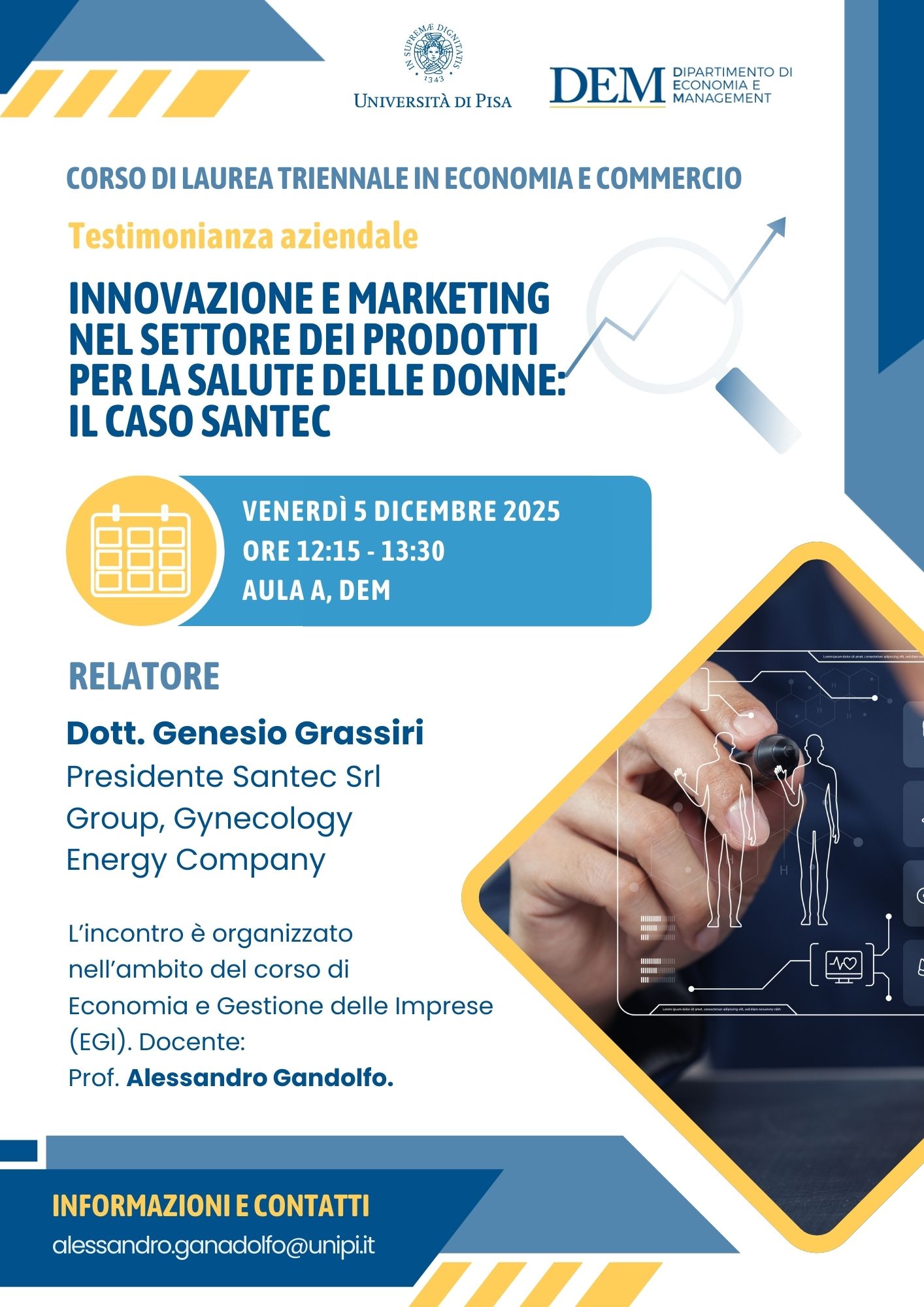 Venerdì 5 dicembre 2025, con orario 12:15 – 13:30, nell’Aula A del Dipartimento di Economia e Management, si terrà l’incontro “Innovazione e Marketing nel settore dei prodotti per la salute delle donne: il caso Santec”, con ospite e relatore il Dott. Genesio Grassiri, Presidente Santec Srl Group, Gynecology Energy Company.