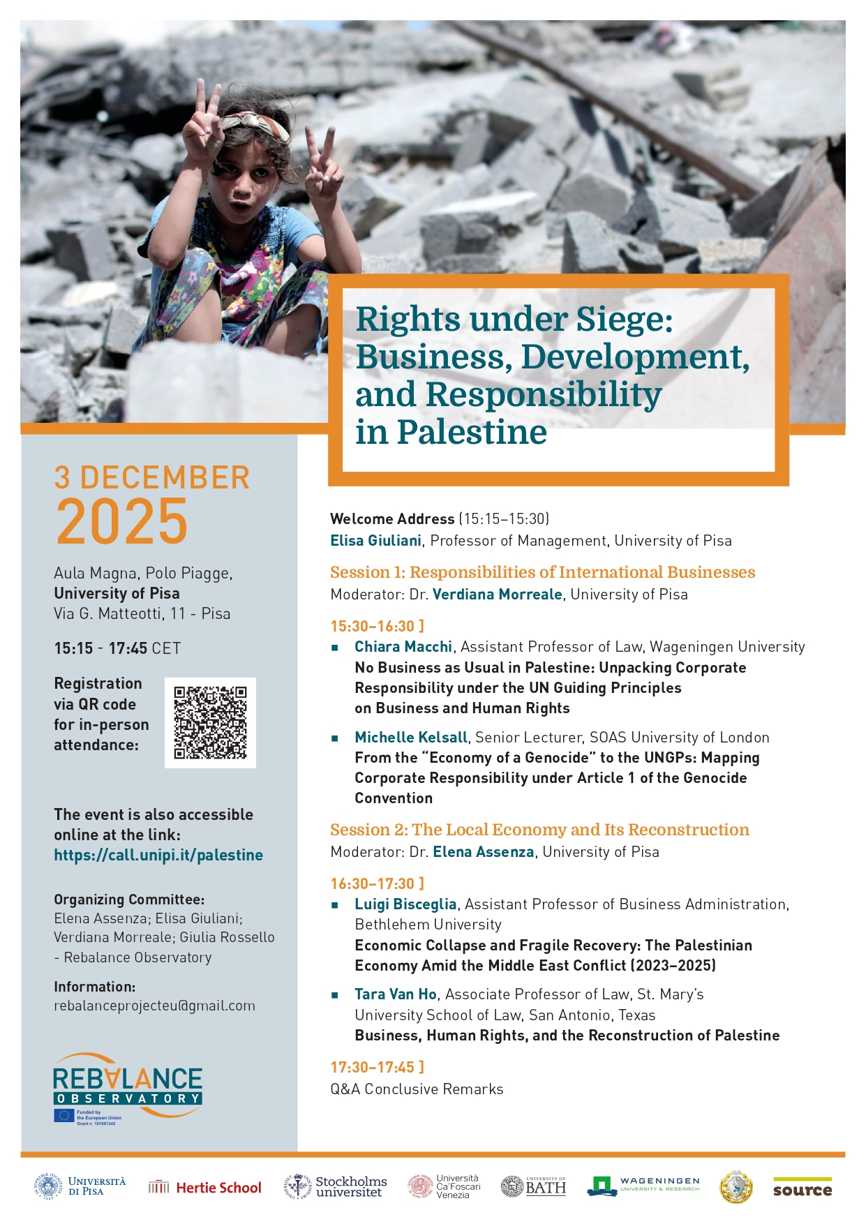 Mercoledì 3 dicembre 2025, dalle 15:15 alle 17:45 (CET), nell’Aula Magna del Polo Piagge, si terrà l’incontro “Rights under Siege: Business, Development, and Responsibility in Palestine”, promosso dal Rebalance Observatory nell’ambito del corso International Management and Marketing del Corso di Laurea in Management for Business and Economics (MBE).