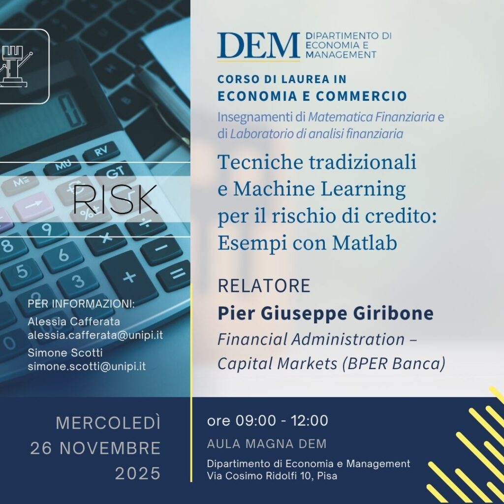 Nell’ambito degli insegnamenti di Matematica Finanziaria e di Laboratorio di analisi finanziaria del Corso di laurea in Economia e Commercio, mercoledì 26 novembre 2025, con orario 9:00-12:00, nell’Aula Magna del Dipartimento di Economia e Management, il Dott. Pier Giuseppe Giribone (Financial Administration – Capital Markets, BPER Banca), terrà il seminario dal titolo: “Tecniche tradizionali e Machine Learning per il rischio di credito: Esempi con Matlab”.