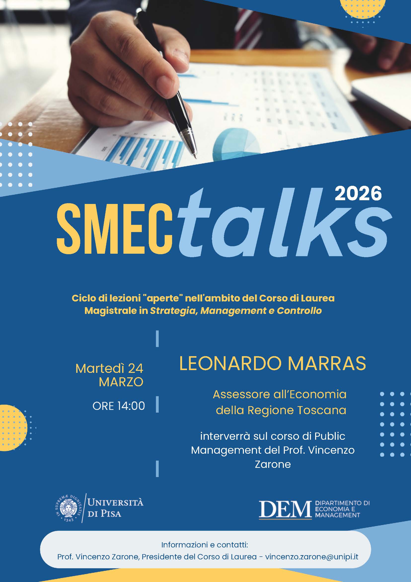 Sono ripartiti gli SMEC Talks, il ciclo di lezioni aperte del Corso di Laurea Magistrale in Strategia, Management e Controllo dell’Università di Pisa.